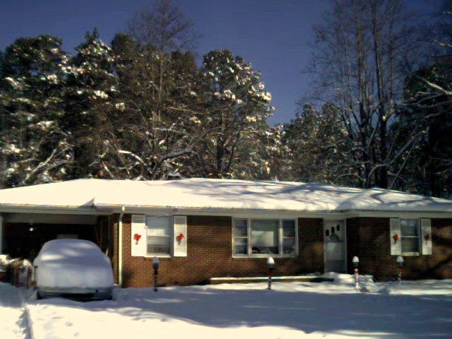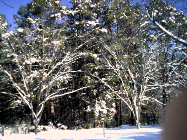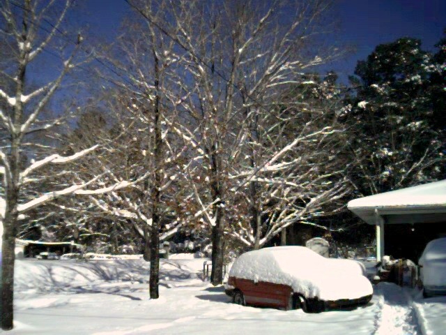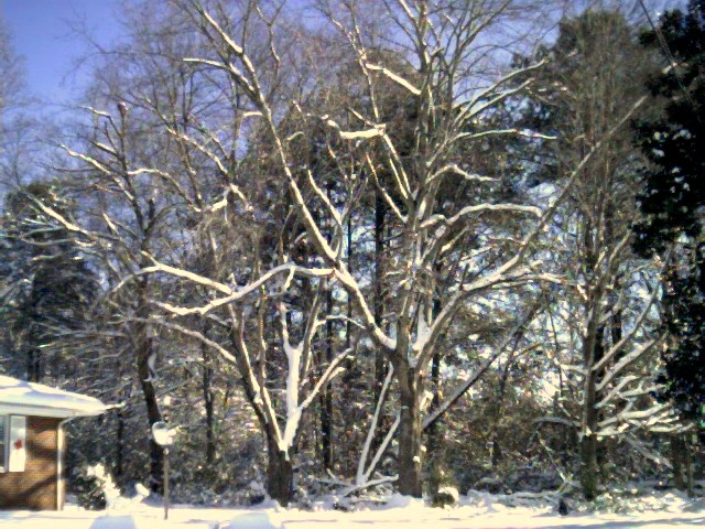 Back towards the cars again, snow on trees, looking at neighbor's house