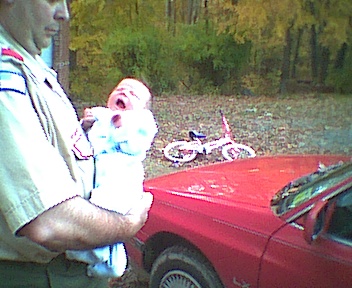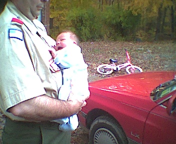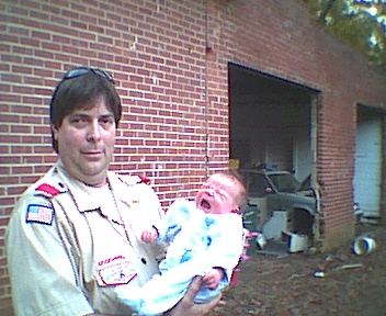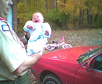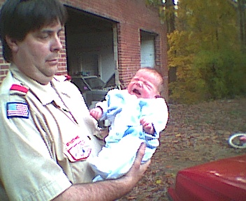 I had to ask Mark to step outside; my new digital camera doesn't have a flash, and there wasn't enough light inside. Mark Alexander wasn't crying; he's just making faces. Daddy was getting him read for Scouts.